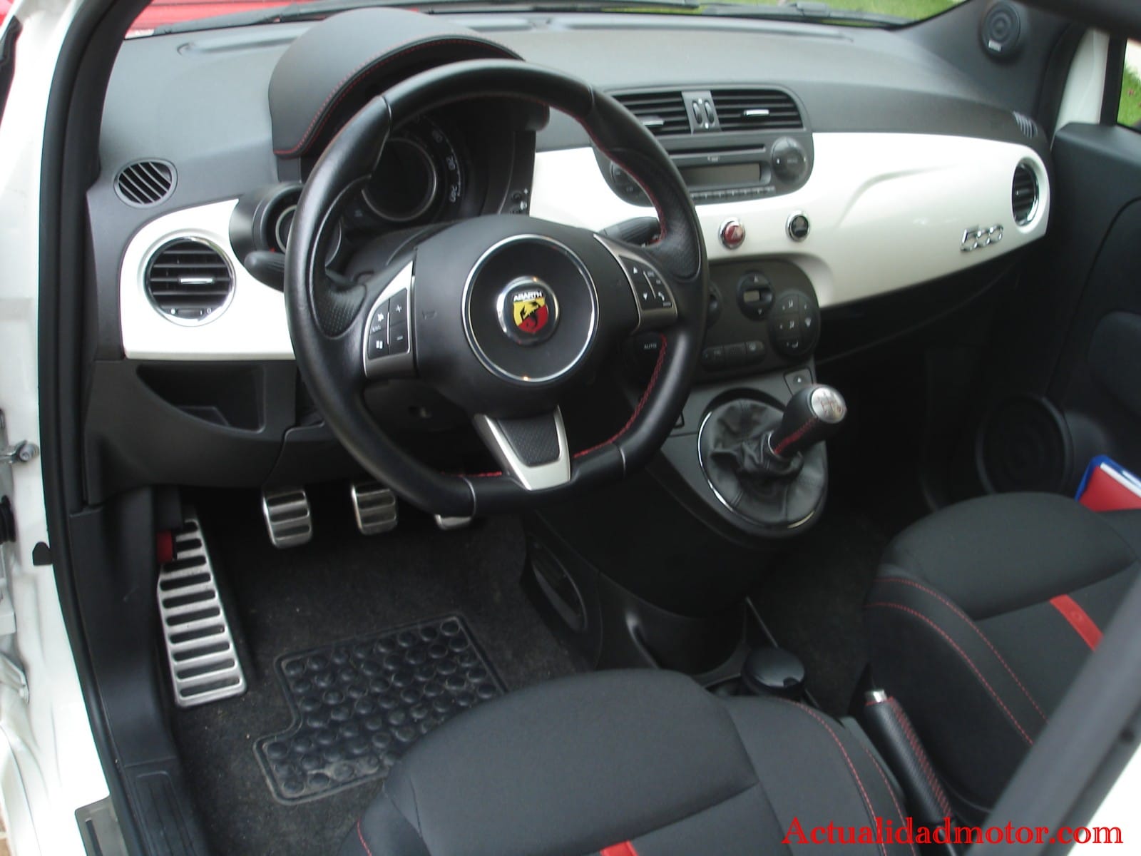 Hay que tener en cuenta que la postura de conducción del Abarth es bastante extraña, similar a la del Fiat 500. El volante queda muy alejado (no se puede regular) y al acercar el asiento nos obliga a flexionar las rodillas, sobre todo la izquierda. No es que sea incómodo, pero hay que acostumbrarse. Cuanto más alto o más cortos tenga los brazos el conductor, peor es la sensación. Una vez sentado resulta extraña la cúpula con tacómetro y velocímetro en la misma esfera. En el centro la pantalla multifunción del ordenador, donde además se indica el volumen de carburante y la temperatura del agua. Como curiosidad en cuarta marcha la aguja de las revoluciones sube enfilada con la velocidad…un puro ejercicio de diseño